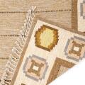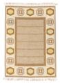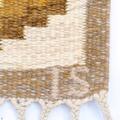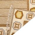 “Torvalla”. Handwoven wool carpet in “rölakan” flatweave technique. Brown base with beige-brown border with geometric decor in shades of yellow, green, blue, pink. Signed IS. Sweden, second half of 20th century. L. 228 cm. W. 164 cm.