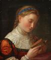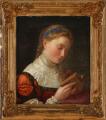 A young woman in renaissance dress reading a book. Unsigned. Oil on canvas. 48×4.5 cm.