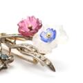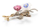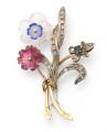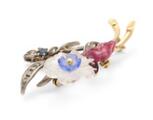 A diamond, sapphire and rock crystal brooch set with rose-cut diamonds, a vcircular-cut sapphire and carved rock crystal, mounted in 18k gold and silver. Weight app. 10.5 g. L. 5.8 cm.