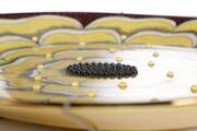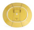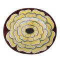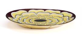 Ovalt fad af fajance med motiv af blomst. Dekoreret med gul, blåsort, pink og mørk bordeauxrød glasur med iriseret overflade. Delvis applikeret med halvugleformede ornamenter med hhv. sort og gul glasur. Tryksign. Udført og stemplet hos Arabia, Finland. H. 5. B. 36,7. L. 42.