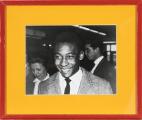Original b/w press photograph of Brazilian soccer player Pelé (Edson Arantes do Nascimento); 1940–2022) together with the Brazilian national soccer team upon arrival at Schiphol Airport in the Netherlands on April 29, 1963. Back with restriction stamp, handwritten note, editorial instruction and stamped newspaper publication date (April 30, 1963). Red painted wooden frame with double glazing. Visible size 16×21 cm. Frame size 27×32 cm.