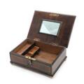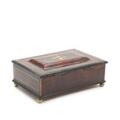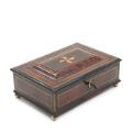 An 18th century Baroque rosewood and faux tortoise shell casket, inlaid with intarsia, interior with mirror and two small drawers. H. 11. L. 29. W. 20 cm.