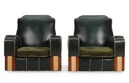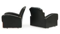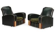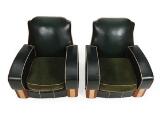 Et par art deco lænestole på hjul, betrukket med grønt skai, løse hynder med grønt velour. 1950'erne. (2)
