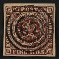 1853. 4 RBS Thiele II, blackbrown. Plate I. SUPERB used with numeral cancel 67: SORØ. Opinion Nielsen: SUPERB. [ 1IIa ] [ ⊙ ]