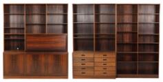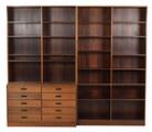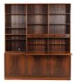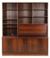 A rosewood wall unit, comprising cabinet with three doors, chest of drawers with 10 drawers, two bookcases and bookcase with foldable writing leaf. Manufactured by P. Jeppesen. 1960s. Total dimensions: H. 191. W. 374. D. 30/40 cm. (5)