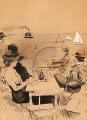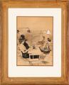 At Langelinie in Copenhagen Harbour. Elegantly dressed people drinking coffee and observing the ships sailing by. Signed with monogram. Drawing ink and wash on paper. 31×23 cm.