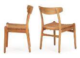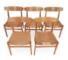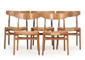 “CH 23”. Et sæt på fem stole med stel af eg, sæder med flettet papirgarn. Udført og stemplet hos Carl Hansen & Søn, Odense. (5)