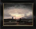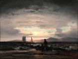 En mand og en lille dreng skuer ud over havet. Utydelig sign. 1860. Olie på lærred. 27×34 cm.