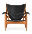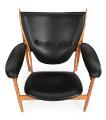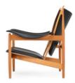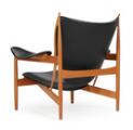“Høvdingestol”. Armstol af lyst teaktræ, betrukket på sæde, ryg og armlæn med sort skind. Model FJ 4900. Udført hos Hansen & Sørensen, Ringkøbing.