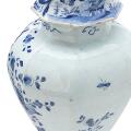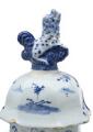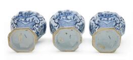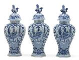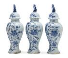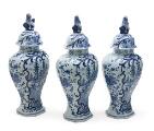 Set of three Dutch Delft earthenware lidded jars, baluster-shaped, decorated in blue “en chinoiserie” with pagodas in a landscape, lid knobs modelled in the shape of Foo dogs, signed for Gerrit Brouwer, 18th century. H. 49 cm. (3)