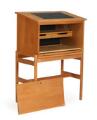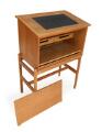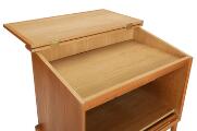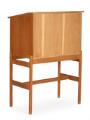 Freestanding oak writing desk, flip up top with slightly raised edge and brass fittings, inlaid with black leather. Front with flip-down leaf, inside with storage and two pull-out trays. Manufactured by Vinde Møbelfabrik. H. 120. W. 82. D. 49 cm.