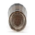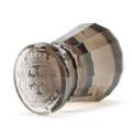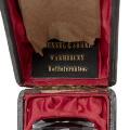 Tysk signet af røgkvartz, af oval og tilspidset form, cabochonsleben top og facetslebet håndtag, bånd skåret med kartouche, hvori en fyrstekronet kartouche med alle elementer fra det glücksborgske våbenskjold, omkranset af den danske elefantorden. I originalt etui af mørkt læder, foret med rød silke, mærket i guld C. Hensel & Söhne, Warmbrunn, Hoflieferanten. Med indlagt seddel i etui, dateret 1883. Tyskland (nuværende Polen), 1880'erne begyndelse. H. signet 7,5 cm. L. etui 12 cm. (2)