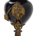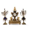 A French Louis XVI style bronze and 'Bleu de Roi' porcelain three-piece mantel set, consisting of a pair of candelabre and a table clock with white enamel dial. Late 19th century. Clock H. 67 cm. W. 50 cm. D. 17 cm. Candelabra H. 60 cm. (3)