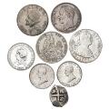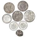 Coll. of coins, Brazil, 2000 Reis 1911, KM 508, Bolivia, 2 Reales 1741, Mexico, 8 Reales 1808, mounting traces, KM 109, Panama, Balboa 1947, KM 13, Peru, Sol 1889, KM 196.24, Uruguay, 50 Centesimos 1917, 2 pcs., KM 22, Venezuela, 5 Bolivares 1904, KM Y 24.2, in total 8 pcs