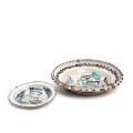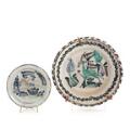 Stettin earthenware dish and plate, decorated in polychrome glaze with jumping deer and horse. 18th century. Diam. 37 and 23 cm. (2)