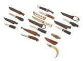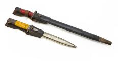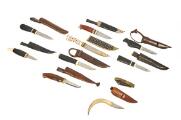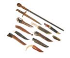 En samling knive bestående af en tidlig lommekniv med knivsblad og gaffel. en sølvbeslået kniv med ca. 9.5 cm. lang mønstersmedet klinge i sølvbeslået skede, en custom kniv med ca. 10,5 cm. langt Mora blad i læderskede, en do af Aage Frederiksen med greb i horn og ca. 6 cm. langt blad mærket AAGE i læderskede. en do med ca. 10 cm. langt umærket blad i læderskede, en do med greb i form af fugl og ca. 8,5 cm. langt umærket blad i læderskede, en do med greb i træ og ben med ca. 6,5 cm. langt Mora blad i læderskede, en do med greb i træ og ben med ca. 8 cm. langt Bruseletto blad i læderskede, en messingmonteret Helle kniv med greb i træ og ca. 9 cm. langt blad i læderskede, en tyrkisk? dolk med greb og skede i messingbeslået dekoreret horn og ca. 16 cm. langt blad, en afkortet dansk M/1867 bajonet med ca. 28 cm. langt blad mærket KAR 5430 SAMT 41171, en tysk KAR 98 nummerems bajonet i skede med gulmalede frebsskaller, en engelsk M/1907 bajonet med rødmalede grebsskaller samt en “kårde” med træskaft og tveægget ca. 56 cm. lang klinge mærket J. M. FYRWALD & CO KJØBENHAVN. (13)