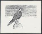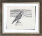 En jagtfalk. Sign. monogram. Pen på papir monteret på papir. Bladstørrelse 20×25,5 cm.