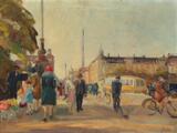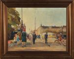 Busy city scene from Copenhagen at Dronning Louises Bro. Signed monogram. Oil on canvas. 30×40 cm.