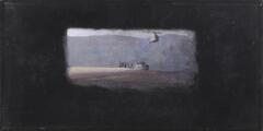 “TV”, 1996. Signeret Nina Sten-Knudsen med titel og datering på bagsiden. Olie på lærred monteret på lærred. 33×65 cm. Uindrammet.