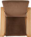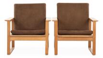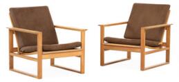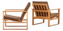 “Runner chair”. A pair of oak easy chairs. Seat and back with woven cane. Cushions upholstered with brown velour. Full grain leather straps. Designed 1956–57. Manufactured by Fredericia Stolefabrik. (2)