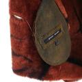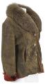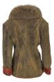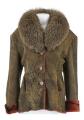 Kort grøn indfarvet rulamsjakke med krave af ræv, knaplukning på front, to lommer og rødligt pelsfor. Længde ca. 64 cm, brystmål 100 cm, ærmelængde 52 cm. Str. L.