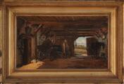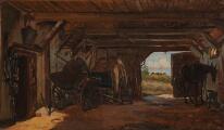 En staldbygning med udsigt fra den åbne port. Sign. Aug. Fischer. Olie på lærred. 22×37.