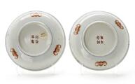 A pair of Chinese enamelled Bajixiang porcelain plates painted with Buddhist auspicious symbols flowers and leaf-scrolls, marked and period of Daoguang (1820–1850). Diam. 15.5 cm. (2)