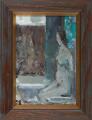 Interior with seated female nude. Signed SE. Oil on board. 29×20 cm.