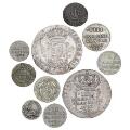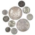 Christian V, samling af mønter, i alt 10 stk. - alle forskellige inkl. 4 mark / krone 1672, 1685, graffiti, H 67A, 79, skilling 1677, 1686, H 75A, 85, 2 skilling 1686, H 84; Glückstadt, 4 skilling 1694, H 128, 8 skilling 1697, H 127A