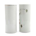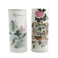 Two Chinese porcelain hat stands decorated in colours, one with ‘The Hundred Antiques’ and pierced work, the other with a landscape. The former marked in red. 20th century. H. 28 and 29 cm. (2)