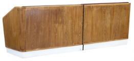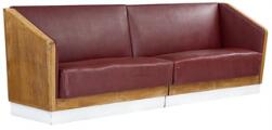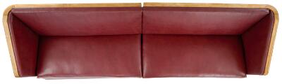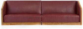 Todelt sofa af bøg og elm. Base af hvidlakeret træ. Betrukket med bordeaux farvet skai. Samlet L. ca. 260.