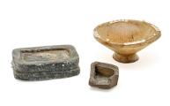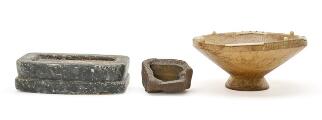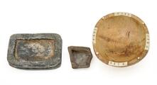 Two lamps of carved soapstone and stone and a wooden bowl with bone mounting. Greenland. L. 7–17 cm. (3)