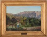Mountain landscape from Gerano with a woman carrying a basket, Italy. Signed Kraft ?. On the reverse inscribed 1853. Oil on canvas. 23×31 cm.