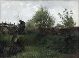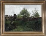 Mark med flettede hegn. Usigneret. Olie på lærred monteret på malepap. 35×48 cm.