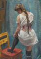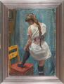 En ung kvinde, der klæder sig på. Signeret Fr. Lange. Olie på lærred. 66×46 cm.