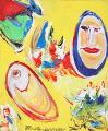 “Æblekrigen”. Sign. Finn Pedersen med titel på bagsiden. Akryl på lærred. 46×30 cm.