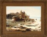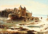 German winter landscape with huntsmen in front of a castle. Signed and dated F. Sødring 1840 and indistinctly inscribed. Oil on paper laid on canvas laid on panel. 45×62 cm.