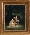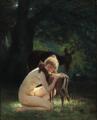 Forest view with a naked woman embracing a baby deer. Signed and dated Otto Bache 1896. Oil on canvas. 35×29 cm.