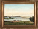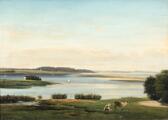 View from a fiord with sailing ships a summer day with a woman enjoying the view in the shadow. Signed N. G. R. Oil on panel. 37×51.5 cm.