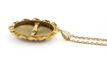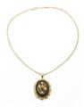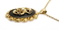 An onyx pendant set with polished black onyx, mounted in 14k gold. Accompanied by necklace of 8k gold. Weight in total app. 24.5 g. Pendant incl. eye-let L. 5.9 cm. L. 49.5 cm. (2)