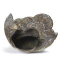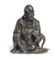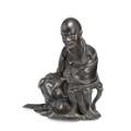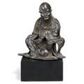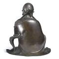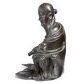 A scholar seated in the position of teaching, holding a scroll in his left hand and resting his arm onto a tripod table, bronze. Late Ming, 17th century. Weight 724 g. H 13.5 cm.