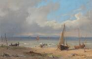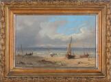 North Zealand coastal scene with fishing boats pulled ashore. Signed monogram 1862. Oil on canvas, laid on panel. 17.5×27 cm.