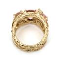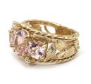 A morganite and diamond ring set with an oval-cut and two circular-cut morganites and two brilliant-cut diamonds, mounted in 9k gold. Weight app. 7.5 g. W. 13 mm. Size app. 52.5.