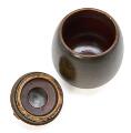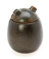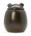 A stoneware tobacco jar, decorated with brownish black and reddish brown glaze. Signed ER. Made and marked by Saxbo, Danmark and W. Ø. Larsen, København. H. 15 cm.
