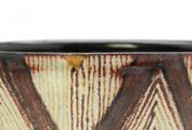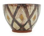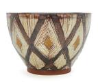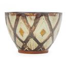 A circular high-fire earthenware bowl. The outside with incised geometric decor, decorated with greyish white, reddish brown and ochre glaze. The inside decorated with brownish black glaze. Signed monogram. Unique. H. 10.8 cm. Diam. 15.7 cm.