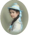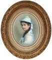 Portræt af en ung kvinde i hvid kjole og en stråhat prydet med blå bånd. Sign. Konkély Leipzig 85. Pastel på papir monteret i passepartout. Oval. Lysmål 62×51.