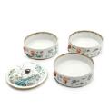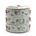 Kinesisk madbeholder af porcelæn i tre sektioner, dekoreret i farver med blomster og insekter, låg med haveparti og fuglepar, i siderne hanke af snoet metal. 20. årh. H. 20. Diam. 19.