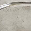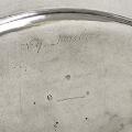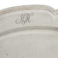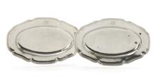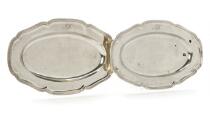 Et par tyske, rokoko og ligeknækkede serveringsfade af sølv, af oval form, lavt spejl, opadvendt fane graveret med initialer HH, svungen og fliget kant, graveret på bagsiden med hhv. nummerering og vægt: “No. 7 = 2 M 14 1/4 lot” og “No. 9 = 2 M 13 lot”. Mestre antagelig brødrene Johann Bernhard Müller og Martin Friedrich Müller, Berlin ca. 1737–1780, oldermandranke, endvidere stemplet antagelig IS eller SI. Vægt 1.260 g. L. 34,5 cm. B. 22,5 cm. (2)