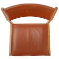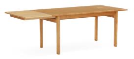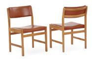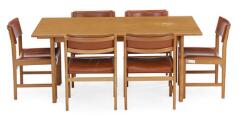 Spisebord, samt seks stole af eg. Sæde og ryg betrukket med brunt skind. Udført hos KP. Møbler. Bord: H. 74, L. 168/218, B . 90. (7)