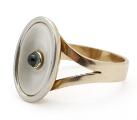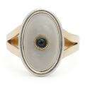 A sapphire and mother of pearl ring set with a cabochon sapphire and mother of pearl, mounted in 14k gold and platinum. Weight app. 5.5 g. W. 18 mm. Size 58.